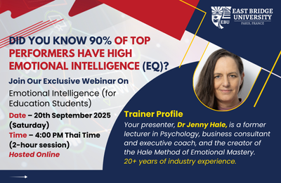 East Bridge University recently hosted an uplifting webinar with Dr. Jenny Hale, where students discovered how understanding and managing emotions can truly shape success in business and in life.