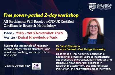East Bridge University (EBU) will host a two-day workshop, Research Methodology - Simplified, for doctorate students at Dubai Knowledge Park. Led by Dr Janat Blackmon, the program focuses on thesis structuring, research methods and offers a CPD UK certificate.